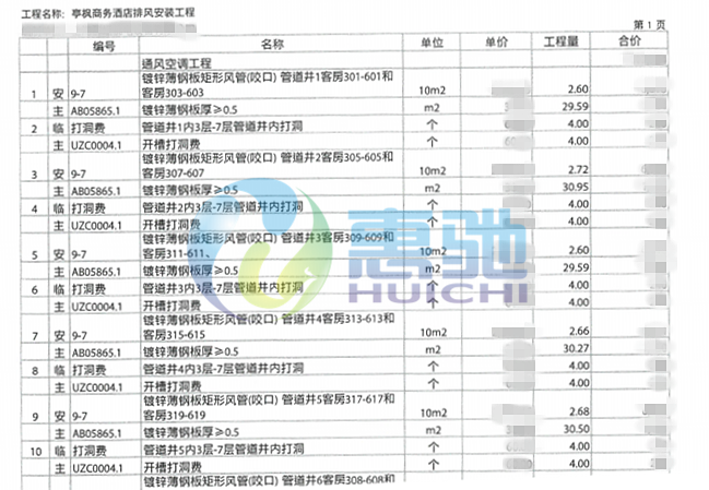 酒店排風改造部分作業明細單